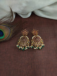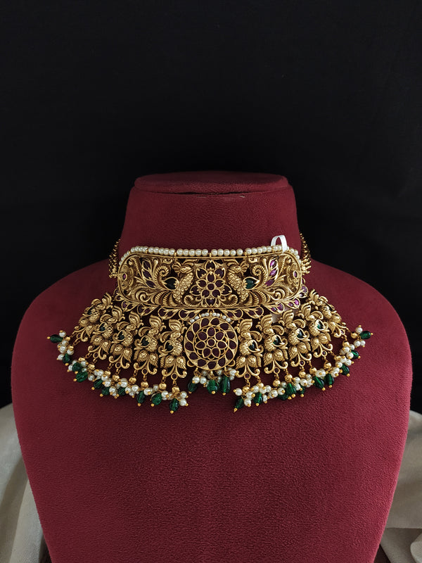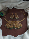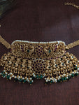 A beautifully crafted antique temple choker set featuring intricate nakshi work, elegant peacock motifs, rich kemp stones, and charming pearls with green onyx bead hangings. With no goddess motifs, this...
