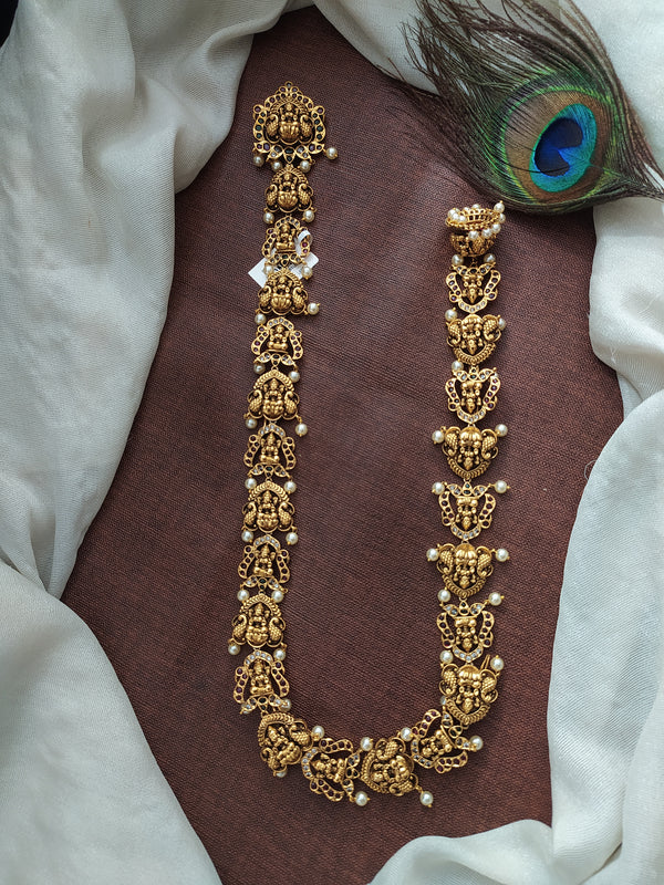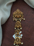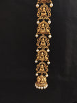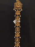 Discover the exquisite charm of our antique choti, a perfect blend of classic allure and contemporary elegance. This elaborate hair accessory is meticulously crafted, featuring regal designs of goddess Lakshmi and peacocks, adorned with kemp, white, and green stones that exude timeless beauty. The shimmering gold antique polish adds a touch of sophistication, making it an ideal choice for a wedding ensemble. Elevate your bridal look with this stunning choti, embodying tradition and refined craftsmanship.