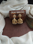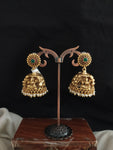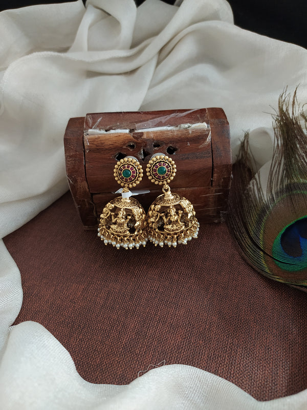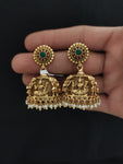 These Antique Lakshmi Jhumkis are crafted to embody the timeless beauty of traditional temple jewelry, featuring intricate Lakshmi motifs that symbolize prosperity and grace. The jhumkis are available in two captivating color combinations—White and Red, as well as Red and Green—making them versatile for a variety of outfits and occasions. The addition of delicate pearl drops adds a touch of elegance and sophistication to the design. These statement earrings are perfect for festive celebrations, weddings, or cultural events.