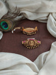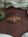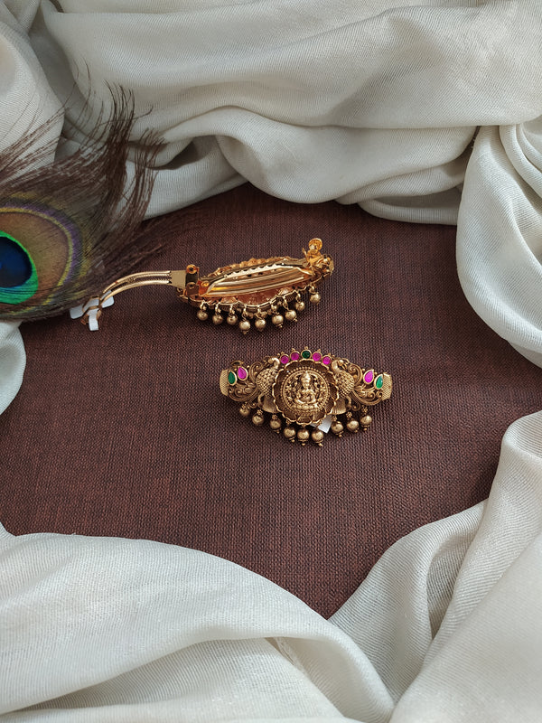 This antique-style hairclip features a divine Lakshmi motif at the center, crafted in a rich matt gold finish. Perfect for traditional occasions, weddings, or festive looks, this clip adds a...