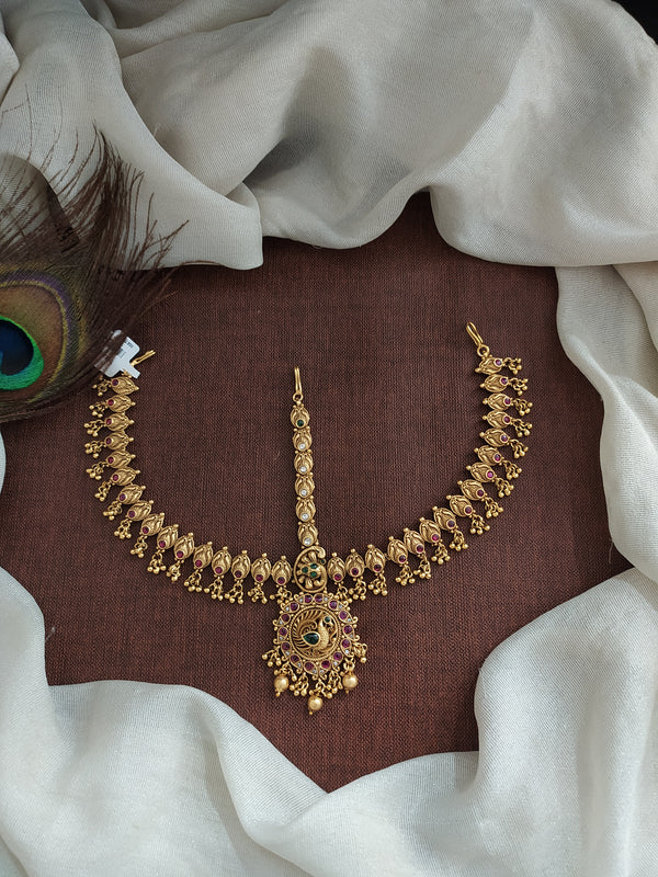Exude elegance with this exquisite Antique Gold Look Peacock Tikka Set, crafted to perfection. Featuring intricate peacock motifs adorned with kemp and green stones, this set is further enhanced with delicate golden hangings, adding a graceful touch to your traditional look. A must-have accessory for weddings and festive occasions, this tikka set brings together heritage charm and artistic beauty.