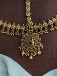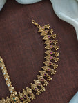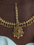 Exude elegance with this exquisite Antique Gold Look Peacock Tikka Set, crafted to perfection. Featuring intricate peacock motifs adorned with kemp and green stones, this set is further enhanced with...