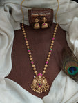 This stunning Antique Lakshmi Pendant Mala Set is designed with half-circle golden balls beautifully crafted Lakshmi pendant seated on a lotus, symbolizing grace and prosperity. The pendant is further adorned with detailed dual peacock motifs on either side, enhancing the opulence of the design. The entire set is intricately crafted with Jadau Kundan stones in the timeless combination of red and green, making it a perfect piece for any traditional or festive occasion.
