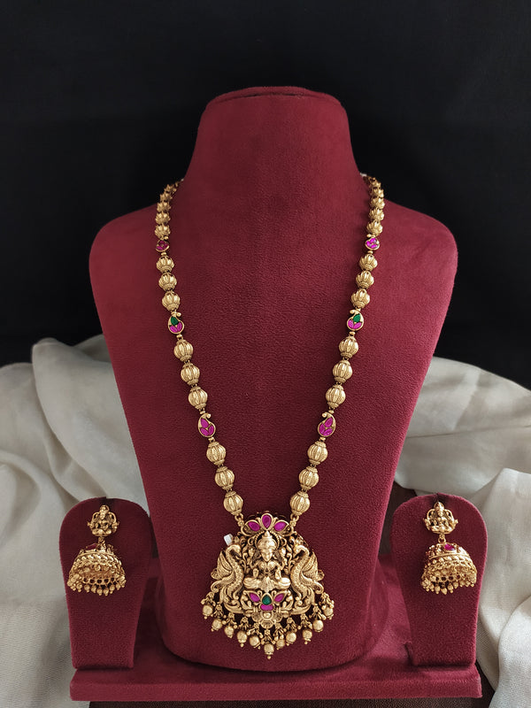 The mala consists of classic round golden beads, adding to the traditional look, while the matching Lakshmi-studded jhumki completes the set with elegance.