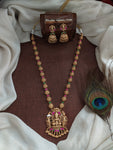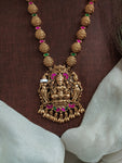 This exquisite Antique Mala Set is a refined piece featuring a Lakshmi pendant in a sitting position on a lotus, carefully crafted with Jadau Kundan stones in a stunning red and...