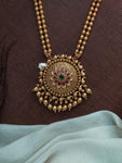 Adorn yourself with the elegance of this Antique Mala Set, designed with practicality and beauty in mind. Featuring two joint layers of intricately crafted half-circled balls, this set ensures a seamless and graceful drape without the twisting associated with full-circle designs. The centerpiece is a stunning floral round pendant, adding timeless charm to the piece.