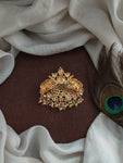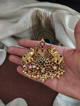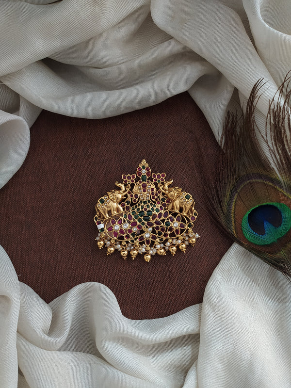This stunning antique pendant features a divine Lakshmi motif, flanked by intricately designed dual elephants, symbolizing prosperity and strength. Crafted with traditional Kemp stones, this pendant radiates royal elegance and vintage...