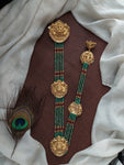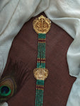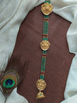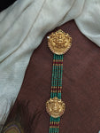 Enhance your festive and bridal look with this Antique Nakshi Work Lakshmi Choti, a stunning temple jewelry piece crafted with intricate Nakshi work. This choti features 5 beautifully designed Lakshmi Billas, arranged in an ascending to descending pattern, creating a regal and structured appeal. The Billas are elegantly connected with mint green and red beads, adding a vibrant touch, and the piece is finished with a dangling jhumki at the end, making it a statement hair accessory.