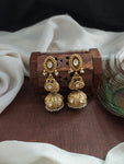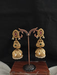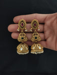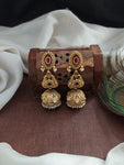 These stunning antique-style long jhumki earrings are available in two beautiful color options: classic white Kundan and vibrant red with green Kemp stones. Designed to make a bold ethnic statement, each pair is intricately crafted and perfect for traditional outfits, weddings, and festive occasions.