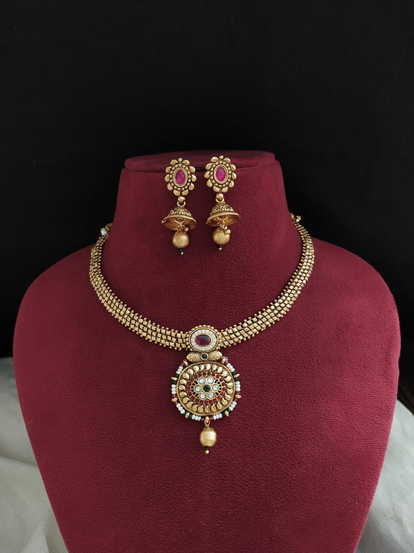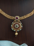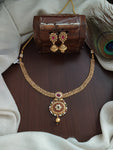 Step into the world of traditional elegance with this Antique Attigai Style Necklace Set, a timeless design that embodies the richness of South Indian heritage. The pendant is gracefully adorned with pearls, ruby, and green stones, offering a vibrant yet subtle charm. The necklace is perfectly complemented by matching jhumka earrings, creating a complete look that is both striking and elegant.