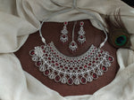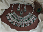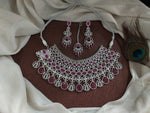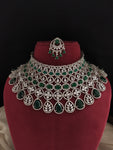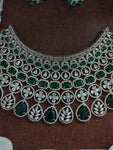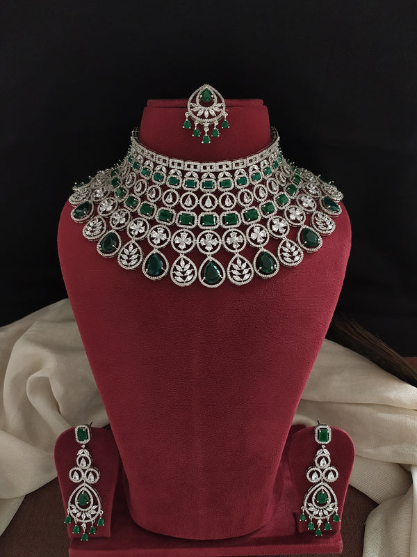 A stunning bridal zircon choker-necklace set crafted with high-quality AD stones, designed to bring a diamond-like brilliance. Perfect for weddings, receptions, or party occasions. Available in multiple vibrant colors – green, red, ruby, blue, and violet. Comes complete with matching earrings and a tikka for a grand bridal look.