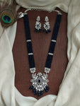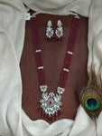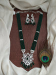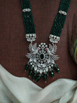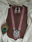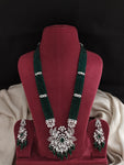 A graceful long diamond replica set, crafted with sparkling crystals and fine diamond-style detailing, enhanced with a touch of colored stones. Available in Green, Blue, Ruby, and Baby Pink. A timeless and elegant choice for weddings, parties, and festive occasions. Comes with matching earrings.