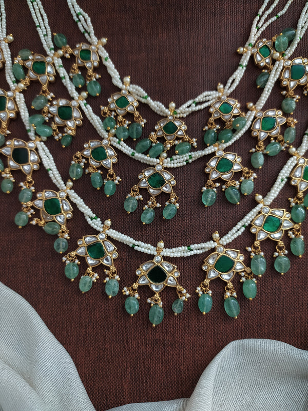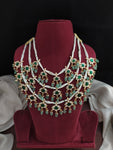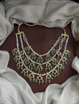 A classic Jadau Kundan triple-layered pearl necklace, designed with white pearls and emerald stone pendants across all three layers. Elegant and traditional, this statement piece is perfect for weddings and festive occasions. Note: This set does not include matching earrings.