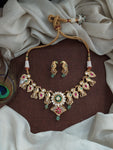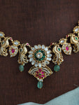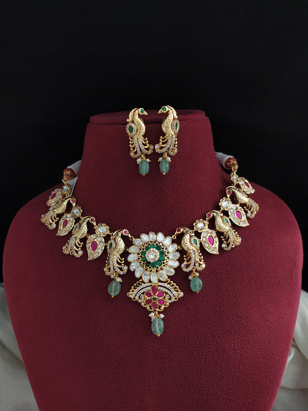 A regal Kundan necklace set featuring an intricate dual peacock motif at the center, beautifully crafted using a blend of shimmering Moissanite stones and traditional Jadau Kundan stones. This piece brings out a perfect fusion of grandeur and elegance, ideal for weddings, festive occasions, or bridal wear. Comes with matching earrings to complete the look.