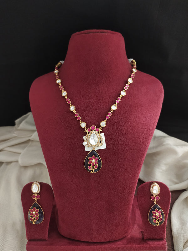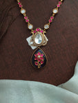 Presenting the Kundan Necklace Set, a captivating blend of White, Ruby, and Violet tones crafted with Jadau Kundan, Quartz, and Moissanite stones. This unique color combination adds depth and character to the design, making it ideal for those who wish to stand out. Each stone has been carefully chosen to create a harmonious yet striking contrast, lending the set a refined and sophisticated charm.
