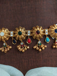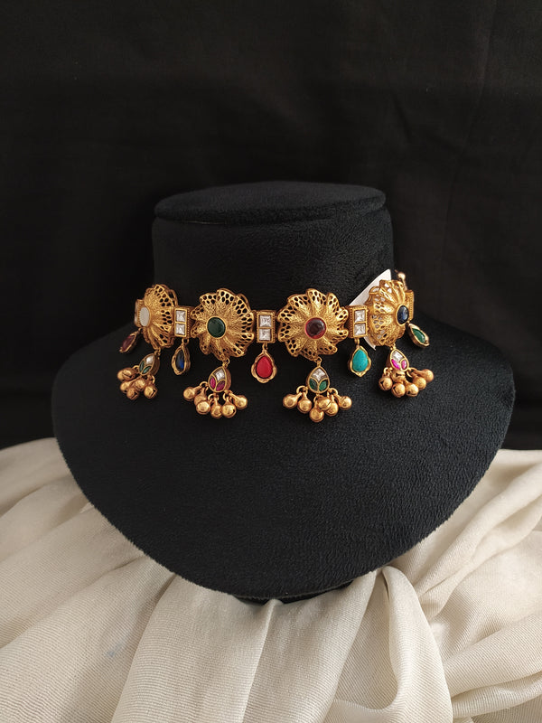 Make a bold impression with this exquisite Navaratan Kundan Choker Set. Designed with vibrant navaratan stones and uncut polki-style kundan work, this statement piece adds a regal touch to your bridal or festive attire. Comes with matching earrings for a complete look.