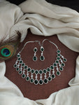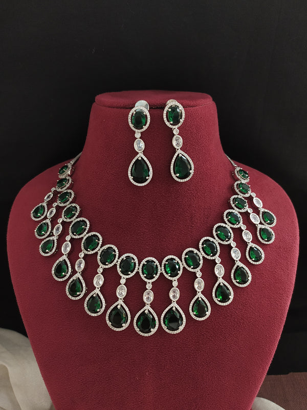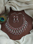 Add a touch of elegance to your collection with this Rhodium Finish Zircon Necklace Set, available in two timeless colors — Green and Ruby. Crafted with precision, the necklace is adorned with high-quality American Diamond (AD) / Zircon stones, delivering a luxurious diamond-like sparkle.