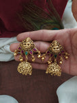 Elevate your traditional look with this stunning antique Lakshmi mango necklace set. The centerpiece showcases the divine presence of goddess Lakshmi, surrounded by intricately designed mango-shaped chains adorned with vibrant red and green stones. The set comes complete with matching Lakshmi-studded jhumki earrings, adding a touch of grace and tradition to your ensemble.