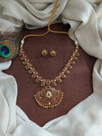 A timeless South Indian bridal classic, this mango kemp necklace set features vibrant red and green stones in a traditional design. Perfect for weddings, temple jewelry looks, and festive occasions. Comes with matching earrings for a complete minimal bridal style.