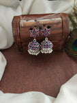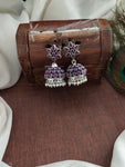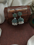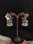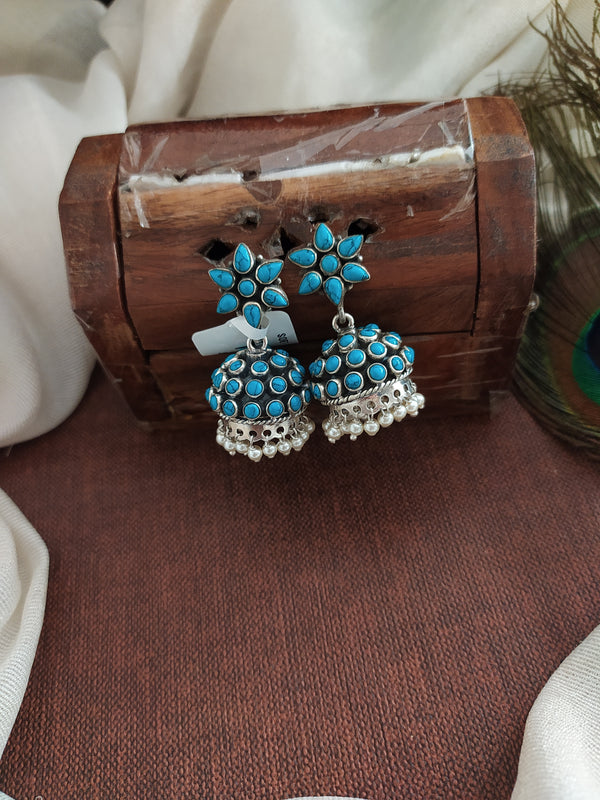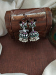 Crafted from 92.5 pure silver, these oxidized jhumkis embody timeless elegance and intricate craftsmanship. The floral-inspired design is adorned with a combination of kemp stones, white stones, and colored gemstones, all beautifully accentuated by delicate pearl drops. These earrings are available in a range of captivating color combinations, including red with green, white, kemp, green, turquoise, and ruby, making them versatile for various festive and traditional occasions.