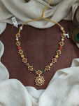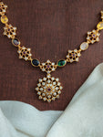 A timeless 92.5 pure silver necklace with 24kt gold plating, this elegant piece is adorned with vibrant Navaratna semi-precious stones. A perfect choice to elevate your festive or traditional look with a pop of color and heritage charm.