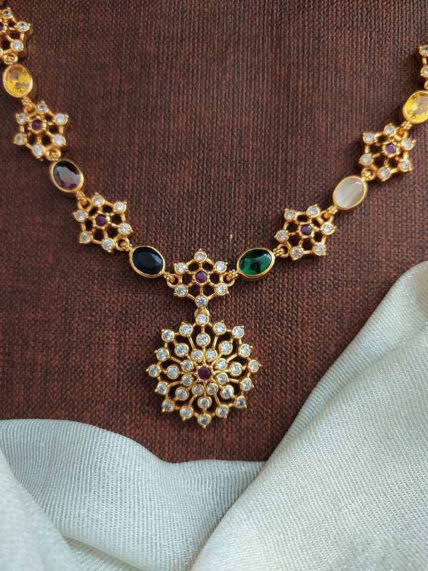 A timeless 92.5 pure silver necklace with 24kt gold plating, this elegant piece is adorned with vibrant Navaratna semi-precious stones. A perfect choice to elevate your festive or traditional look...