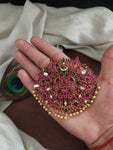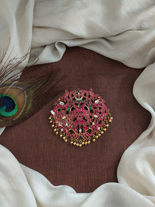 Handcrafted in 92.5 pure silver, this traditional pendant is adorned with Jadau Kundan stones and features a religious-inspired design. Ideal for pairing with gold chains or customizing with beads or a silver chain. Back hook provided for easy wear. For customization, DM us on WhatsApp at +91 96772 59007.