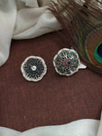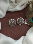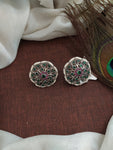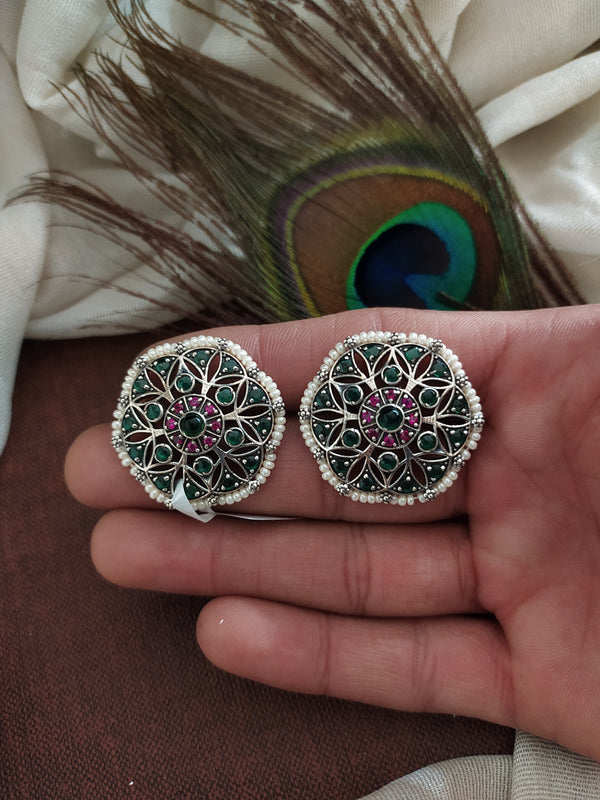 Beautifully crafted 92.5 pure silver studs featuring ruby and green stones, delicately edged with a layer of pearls for a traditional yet graceful touch. Available in two classic color combinations: