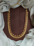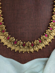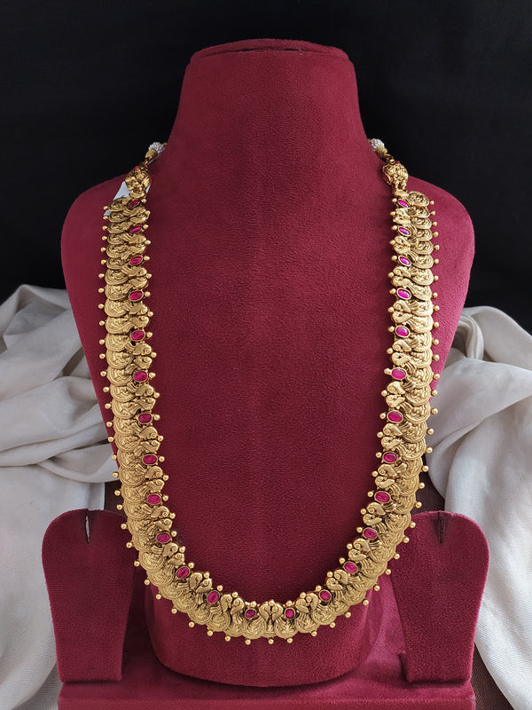 Crafted in 92.5 pure silver with a 24kt gold polish, this Mantrika Mala is a timeless Kasu Malai long haram featuring traditional Lakshmi motif coins and delicate ruby stones. A stunning blend of heritage and elegance, it adds a graceful touch to any traditional ensemble—perfect for weddings, poojas, or festive occasions.
