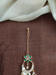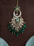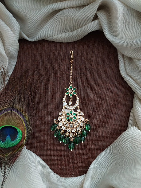 Elegant Polki Kundan tikka in green stones, crafted with intricate detailing for a traditional yet timeless look. Perfect for brides, bridesmaids, or pairing with lehengas, sarees, and festive outfits. A must-have accessory for weddings, receptions, and cultural occasions.