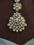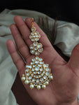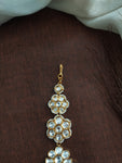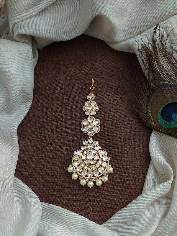 This Polki Kundan White Tikka is a beautiful blend of traditional craftsmanship and modern elegance, featuring an intricate floral design that is adorned with dazzling Polki Kundan stones. The tikka is enhanced with delicate pearl drops, making it an ideal accessory for weddings, festivals, or other grand occasions.