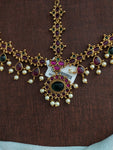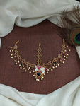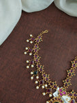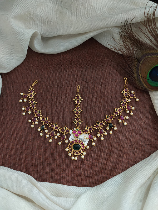A timeless Kemp stone tikka set adorned with pearl drops, perfect for adding a regal touch to your traditional look. An elegant hair accessory that beautifully complements bridal and festive attire.