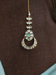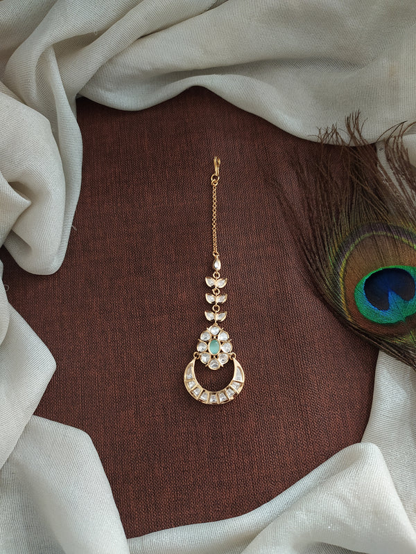 Add a regal touch to your look with this classic Kundan Tikka, featuring a striking mint green center stone, surrounded by white uncut Kundan stones. Its intricate craftsmanship makes it a perfect accessory for weddings, festive occasions, and traditional ensembles.