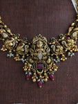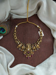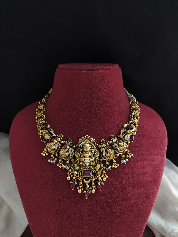 A timeless bridal/festive necklace set crafted in 92.5 pure silver with rich antique Nakshi work. It features a majestic Lakshmi motif at the center, flanked by peacocks across the neckline....
