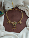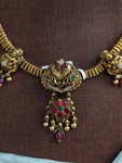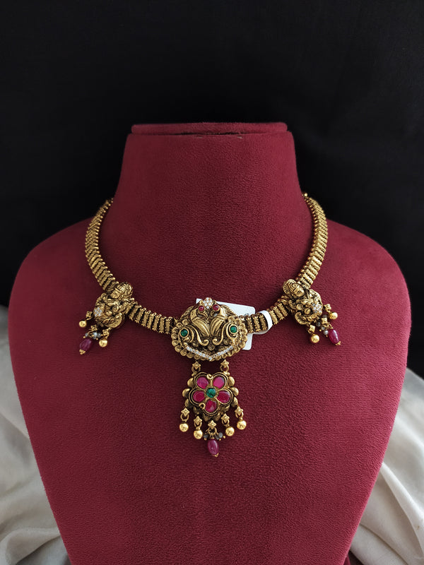 Crafted in 92.5 pure silver with intricate Nakshi work, this elegant and minimal design gives a perfect gold-like finish. The necklace features a center Lakshmi pendant, flanked by two majestic...