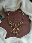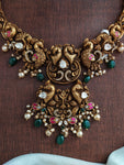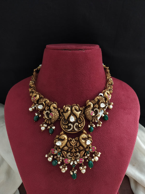 A majestic statement bridal necklace set handcrafted in 92.5 pure silver with rich antique nakshi work and gold plating. The design features intricate peacock motifs and a brilliant fusion of...