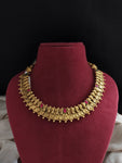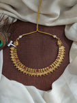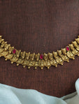 Crafted in 92.5 pure silver, this traditional antique Kaasu Maalai necklace features intricately detailed coin (kaasu) motifs with embedded ruby stones for a rich, heritage-inspired look. The matte gold finish...