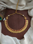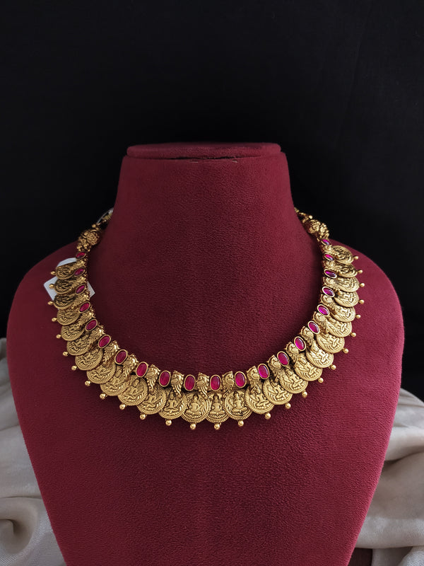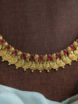Crafted in 92.5 pure silver, this traditional antique Kaasu Maalai necklace features intricately detailed coin (kaasu) motifs with embedded ruby stones for a rich, heritage-inspired look. The matte gold finish...