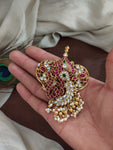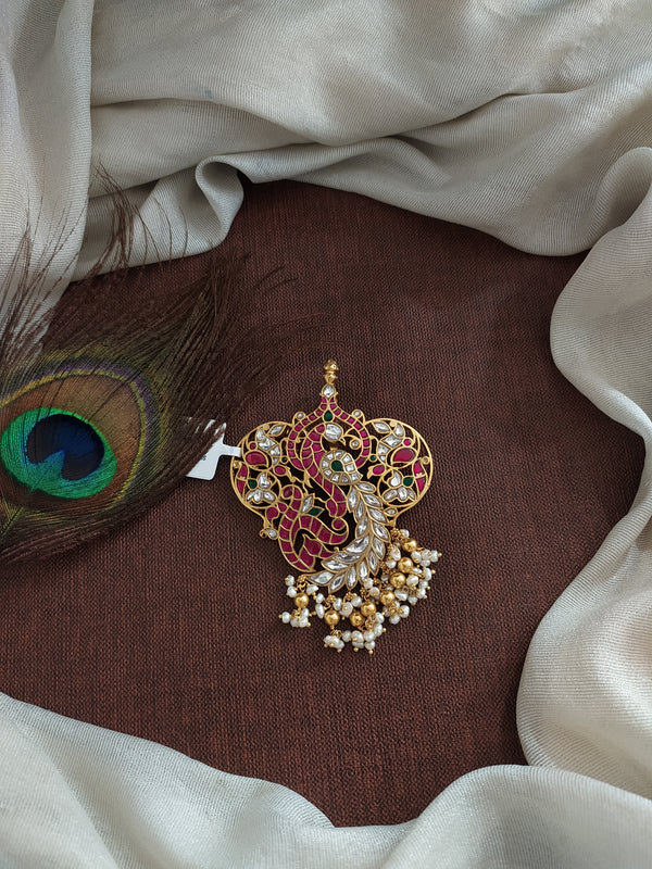 Crafted in 92.5 pure silver, this exquisite peacock design pendant is adorned with traditional Jadau Kundan stones. Designed with a back hook, it pairs effortlessly with gold chains. You can...