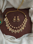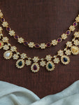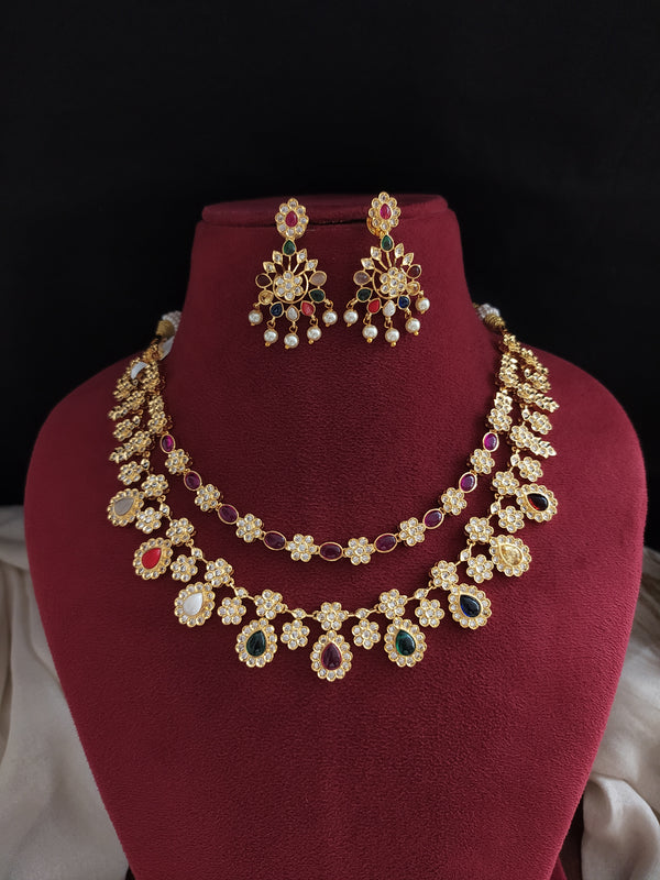 A timeless antique gold-finish necklace set adorned with classic Navaratna stones – each representing celestial significance. Crafted to blend tradition with elegance, this set comes with matching earrings, perfect for...