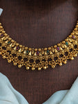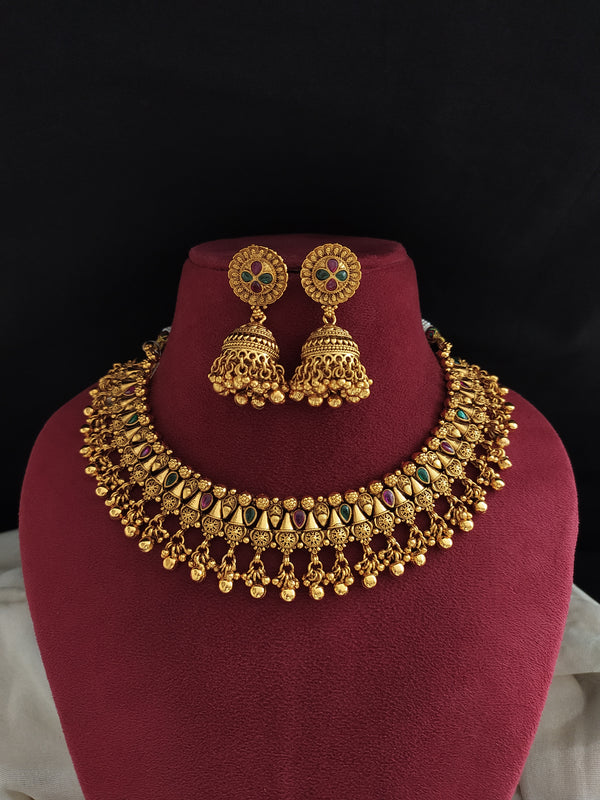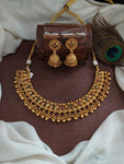 A beautifully crafted antique gold necklace set featuring elegant kemp and green stones with signature gold ball hangings for a rich traditional look. Designed without any goddess motifs, making it...