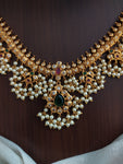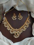 What are you waiting for if you love a set with more pearls? Here is our Antique Guttapusalu Necklace Set, crafted with kemp and green stones for a traditional look....