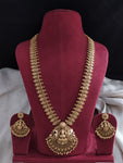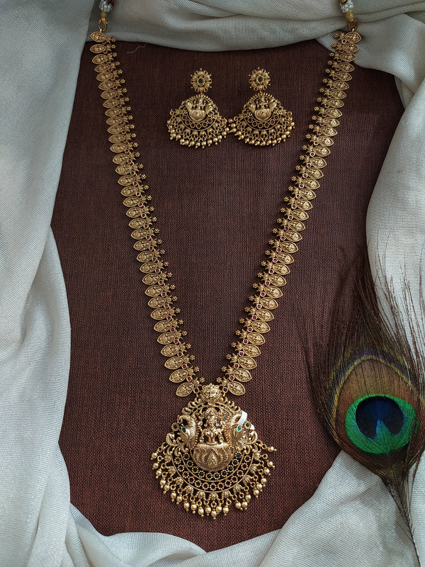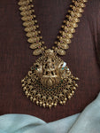 A majestic Antique Lakshmi Long Haram Set crafted in classic temple jewellery style, featuring Goddess Lakshmi motifs that symbolise prosperity, grace, and timeless tradition. Designed in a rich antique gold...
