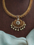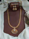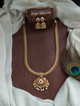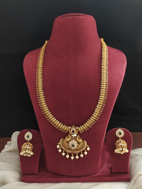 An elegant antique long haram set with intricate nakshi craftsmanship featuring a regal peacock motif pendant. This piece is free of idols, making it versatile for all preferences. Comes with...