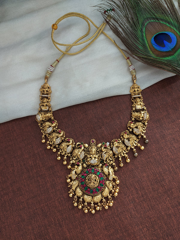 Crafted with the utmost attention to detail, this stunning necklace features a classic antique polish silver finish with intricate golden danglings and a vibrant ruby stone at the center.