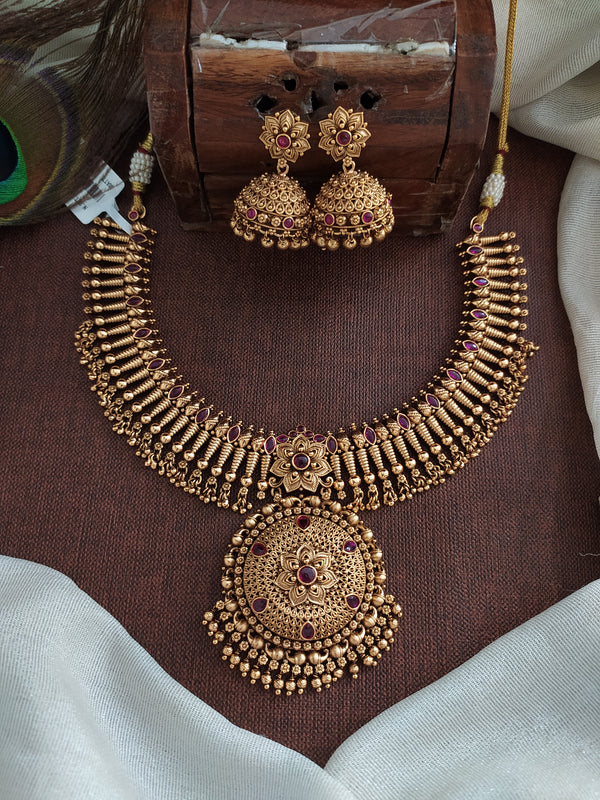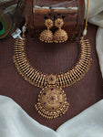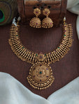 A beautifully crafted antique traditional necklace set with matching jhumki, designed without any goddess or peacock motifs — making it perfect for all communities and all occasions. The intricate antique...