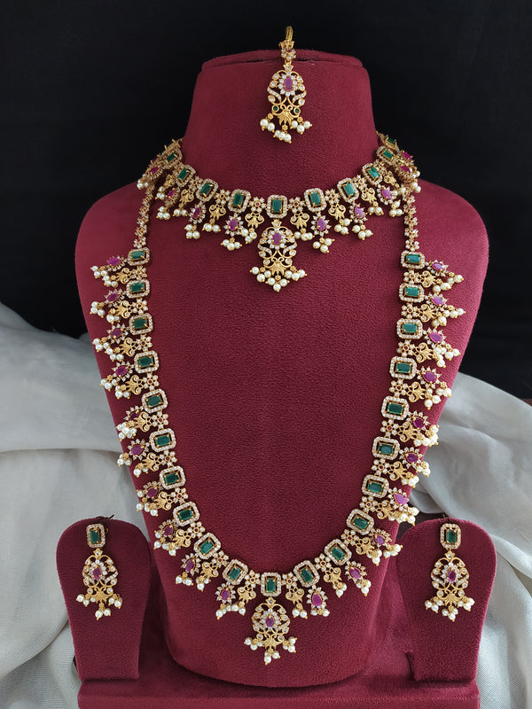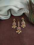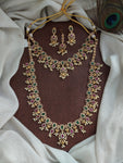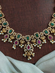 A complete bridal jewelry set designed in an antique finish, crafted with vibrant Kemp and green AD stones, beautifully enhanced with pearl hangings. This budget-friendly set includes a necklace, long...