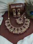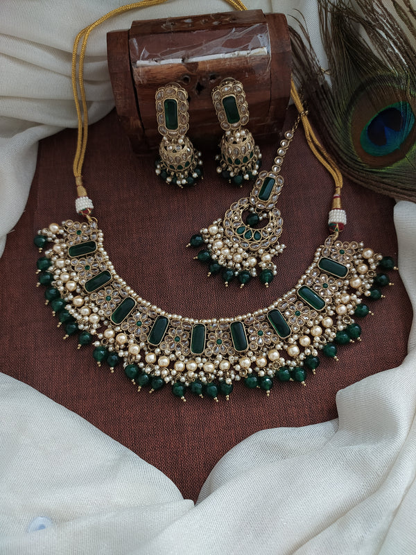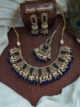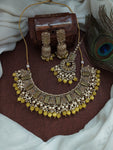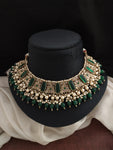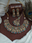 Indulge in the exquisite beauty of this stunning Mehandi necklace set, designed to captivate hearts with its charming droppings and clusters of lustrous pearls. Available in five enchanting colors—green, blue,...