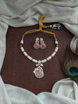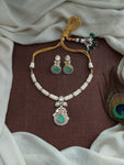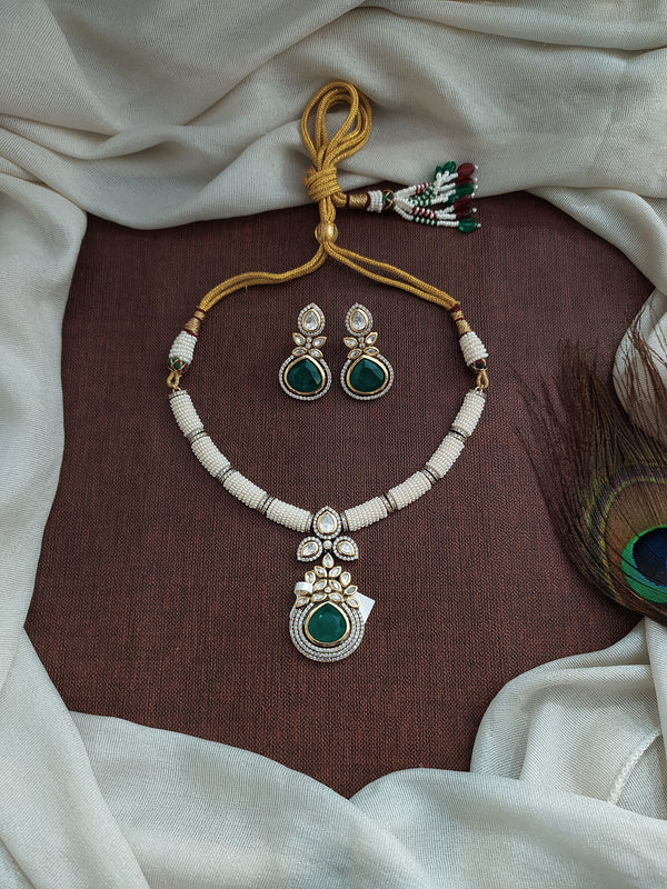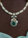 A designer Polki Kundan Hasli set, beautifully embedded with pearls all around and crafted with premium Polki Kundan stones. Available in four elegant colors — green, ruby, mint, and baby...