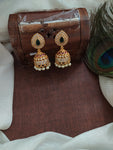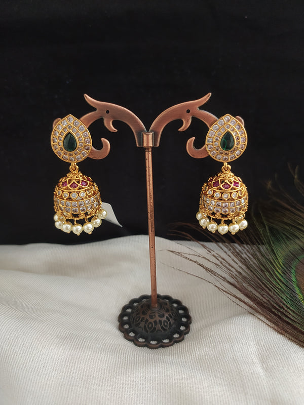 Adorn yourself with our exquisite Gold-Plated Pear-Shaped Jhumki, featuring a mesmerizing combination of white, green, and red stones. Choose from two stunning color combinations - one with a vibrant mix...